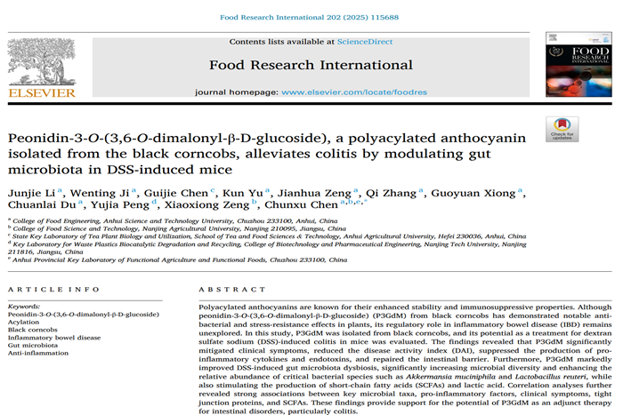 近日,食品科学与工程学院陈春旭副教授以通讯作者身份在国际Top期刊《Food Research International》(Q1,影响因子7.0)发表了题为“Peonidin-3-O-(3,6-O-dimalonyl-β-D-glucoside), a polyacylated anthocyanin isolated from the black corncobs, alleviates colitis by modulating gut microbiota in DSS-induced mice”的高水平研究论文,展现了新年新气象。该论文的第一作者为2022级食品加工与安全专业硕士研究生李俊杰,星空线上平台(集团)官方网站为论文第一完成单位,南京农业大学曾晓雄教授课题组为合作单位。