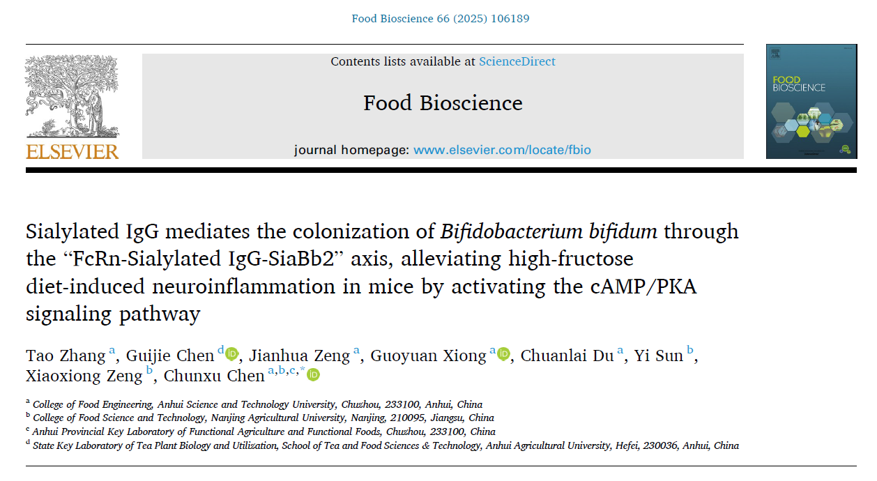 近日,食品科学与工程学院陈春旭副教授以通讯作者身份在国际Top期刊《Food Bioscience》(Q1,影响因子4.8)发表了题为“Sialylated IgG mediates the colonization ofBifidobacterium bifidumthrough the “FcRn-Sialylated IgG-SiaBb2” axis, alleviating high-fructose diet-induced neuroinflammation in mice by activating the cAMP/PKA signaling pathway”的研究论文,论文的第一作者为星空线上平台(集团)官方网站2023级食品加工与安全专业硕士研究生张涛,星空线上平台(集团)官方网站为第一完成单位,南京农业大学曾晓雄教授课题组为合作单位。
