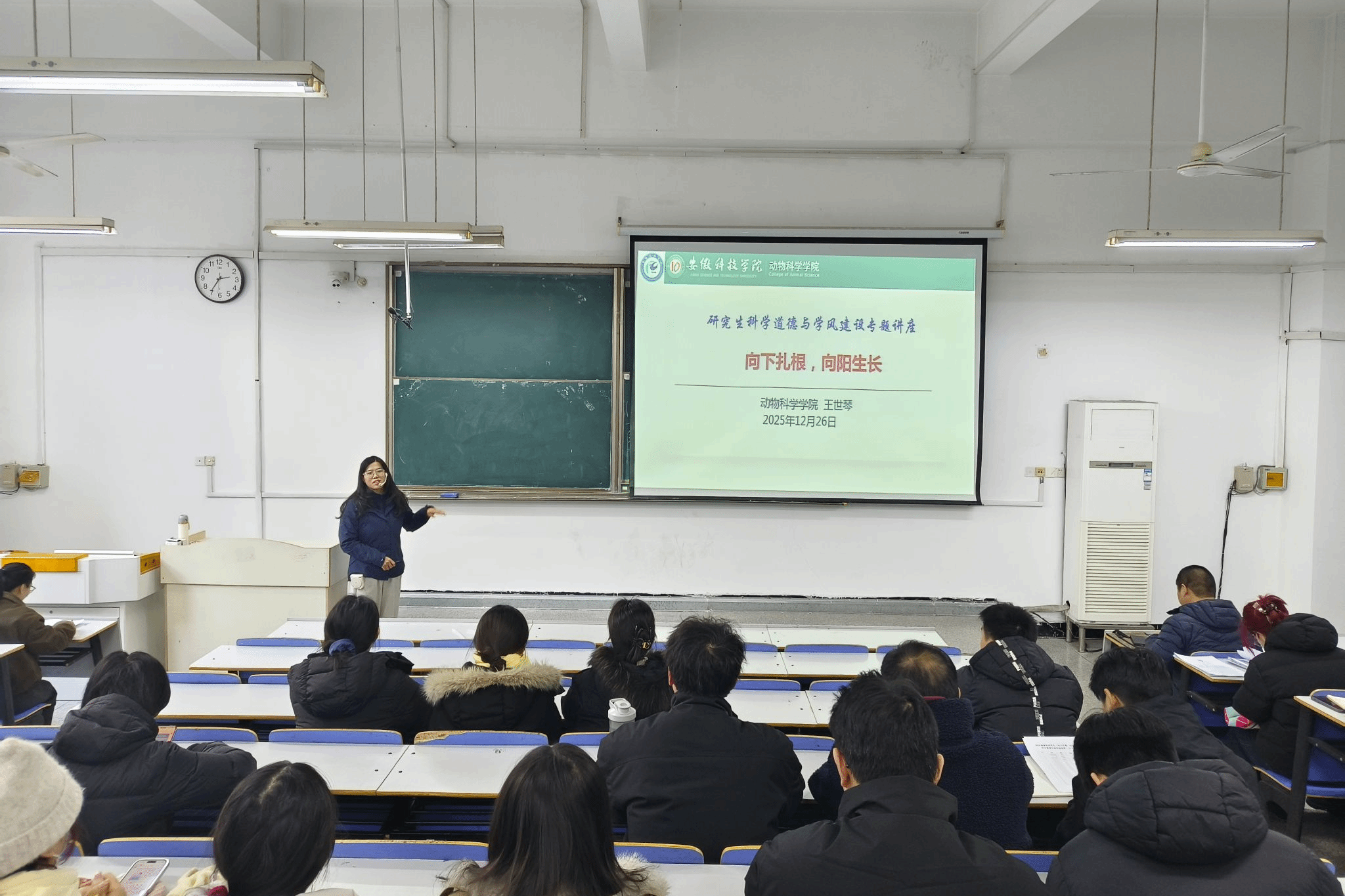 在此扎实基础上,学院于12月26日特邀农业(畜牧)专业硕士研究生导师王世琴博士,作了题为“向下扎根,向阳生长”的专题报告。王世琴博士结合个人求学科研经历,深入阐述了坚守科研道德底线的深远意义,分享了研究生阶段学风修养的具体路径。她指出,“向下扎根”的深度决定着未来“向阳生长”的高度,为同学们应对科研困惑、坚定学术志向提供了极具针对性的宝贵指引。