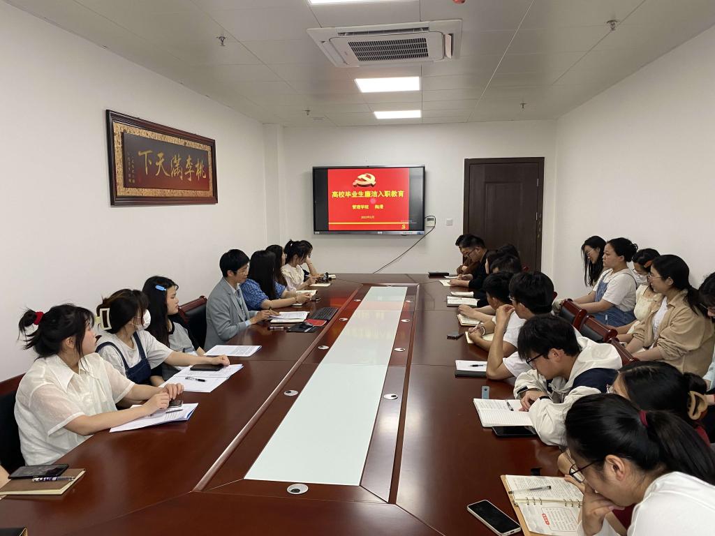 为提升2023届毕业生的廉洁从业及规矩意识,近日,管理学院纪委书记陶漫在西辅楼204会议室为2023届毕业生党员作了题为“扬廉洁之风,护航精彩人生”的廉洁入职专题讲座,学院专职辅导员及2023届在校毕业生代表聆听讲座。