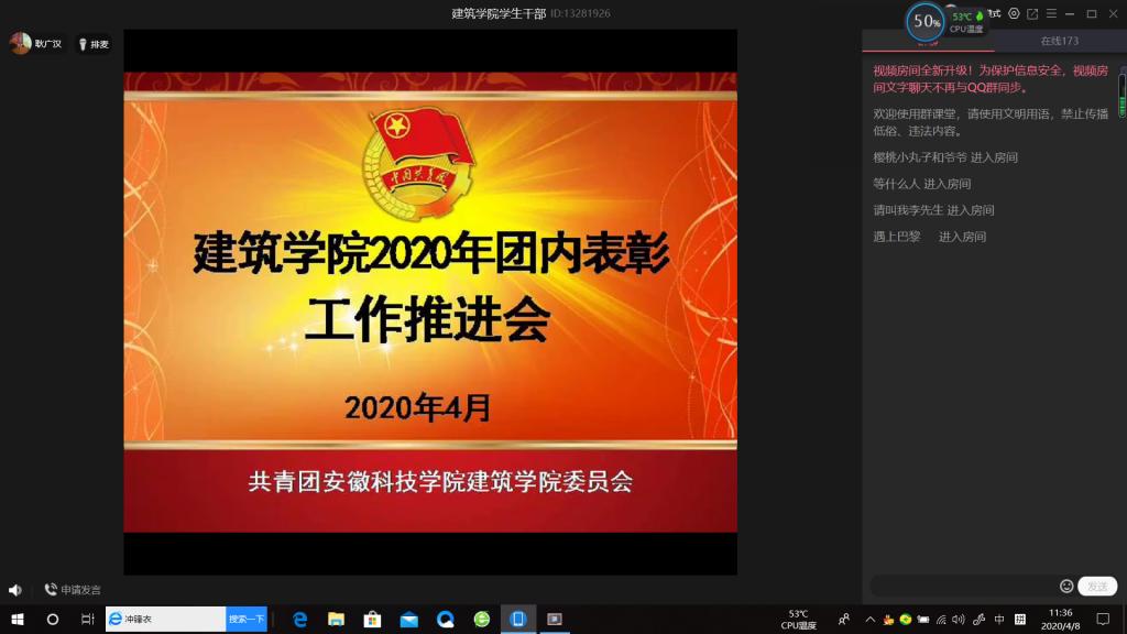 为规范评选表彰程序,营造以评促建的浓厚氛围,4月8日,建筑学院线上召开2020年团内表彰工作推进会议。会议由建筑学院团委书记耿广汉主持,近200名学生干部参加会议。