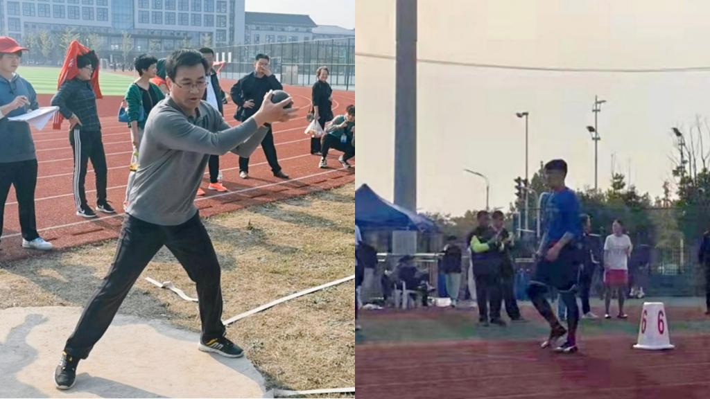 学院党委书记傅友福老师与郑艺鸿老师在男子双手抛实心球比赛中赛出实力,赛出水平,分别荣获第五名和第八名。