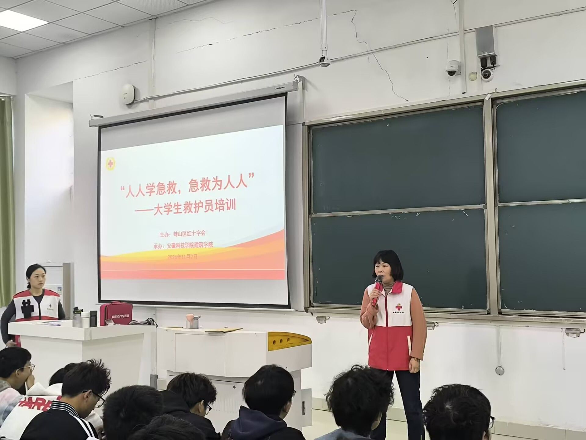 为普及急救知识,提升学生的应急救护能力,11月2日,建筑学院在致知楼C111、致知楼B111开展红十字救护员培训。安徽省荣军医院副主任护师张燕、蚌埠市第三人民医院急救站站长张辉受邀主讲,建筑学院2024级全体学生积极参与。