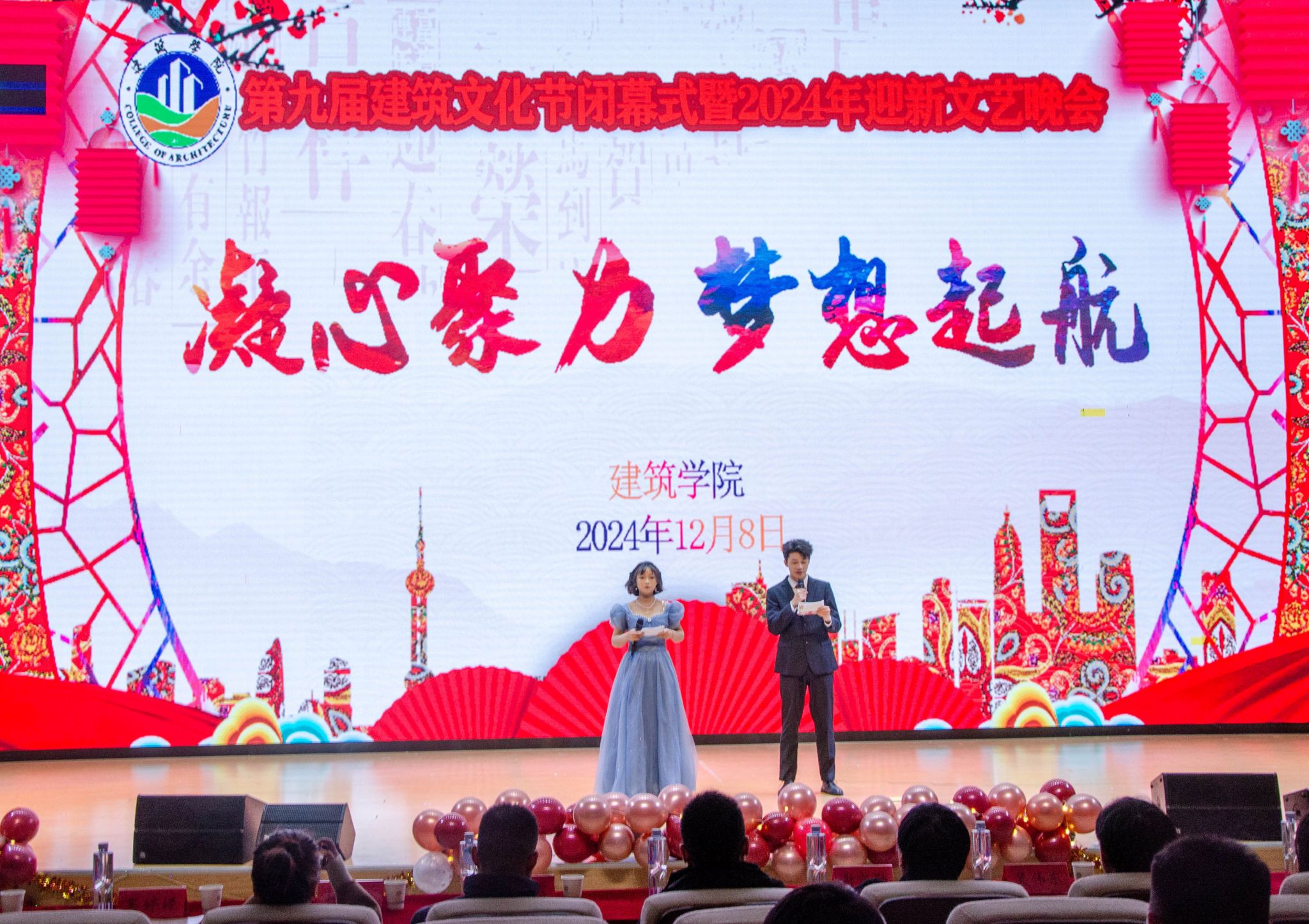 凝心聚力,梦想起航。12月8日晚,建筑学院在“一站式学生社区”活动中心成功举办第九届建筑文化节闭幕式暨2024年迎新文艺晚会。学院党政领导、全体辅导员、教师代表、龙湖校区兄弟学院部分老师,以及学院2023、2024级全体学生参加闭幕式,并全程观看了晚会。