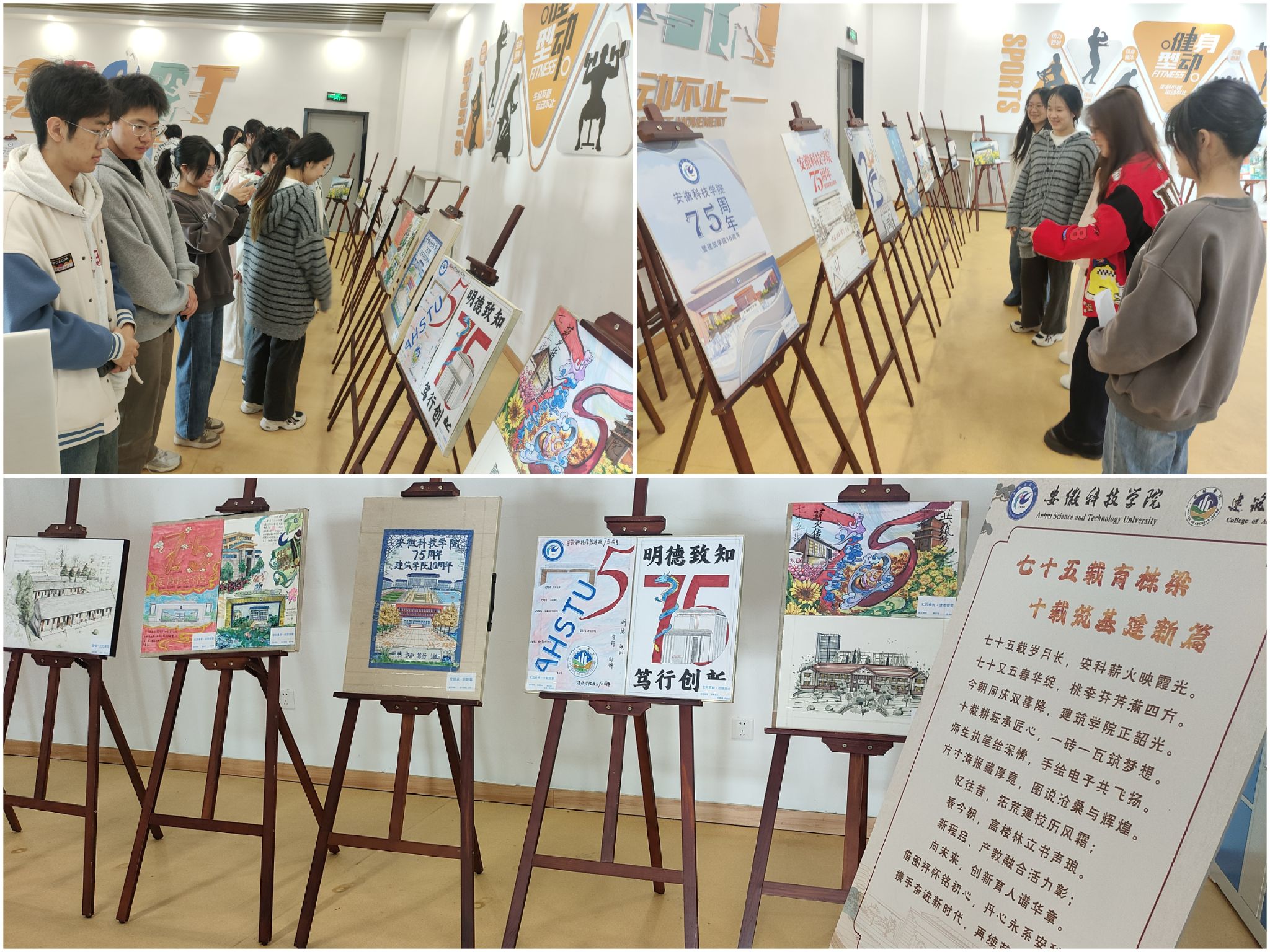 参展作品以图文结合的方式呈现,聚焦星空线上平台(集团)官方网站75年来的办学历程和建筑学院10年的发展足迹。有的作品回顾了学校发展中的重要节点,有的记录了学院成长中的难忘瞬间。同学们用简洁的文字和清晰的视觉设计,表达对校园生活的观察与思考。这些作品既体现了基本的设计能力,也流露出对学校和学院发展的关注。观展师生在驻足观看的过程中,不仅了解了校院的发展脉络,也在细节中感受到一种真实而朴素的情感共鸣。