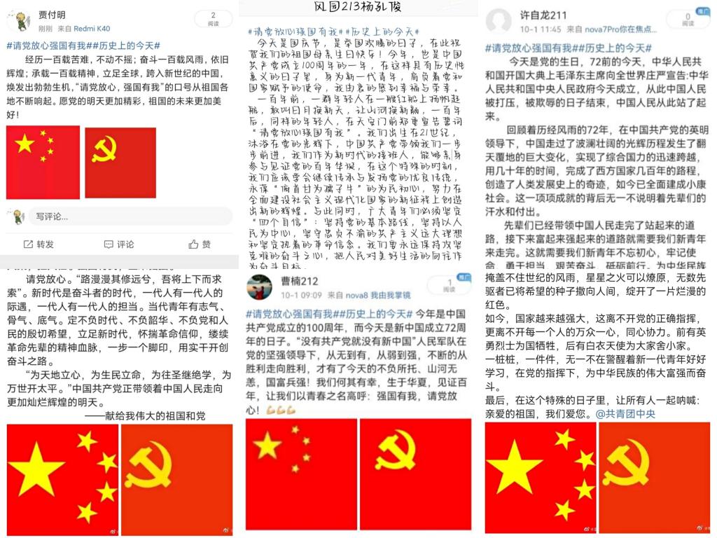 为深入学习贯彻习近平总书记“七一”重要讲话精神,赓续红色血脉,担当强国使命,建筑学院青年志愿者协会团支部于10月1日发起“请党放心 强国有我”线上主题团日活动,广大青年纷纷在微博、朋友圈祝福祖国生日快乐,抒发爱国情怀。