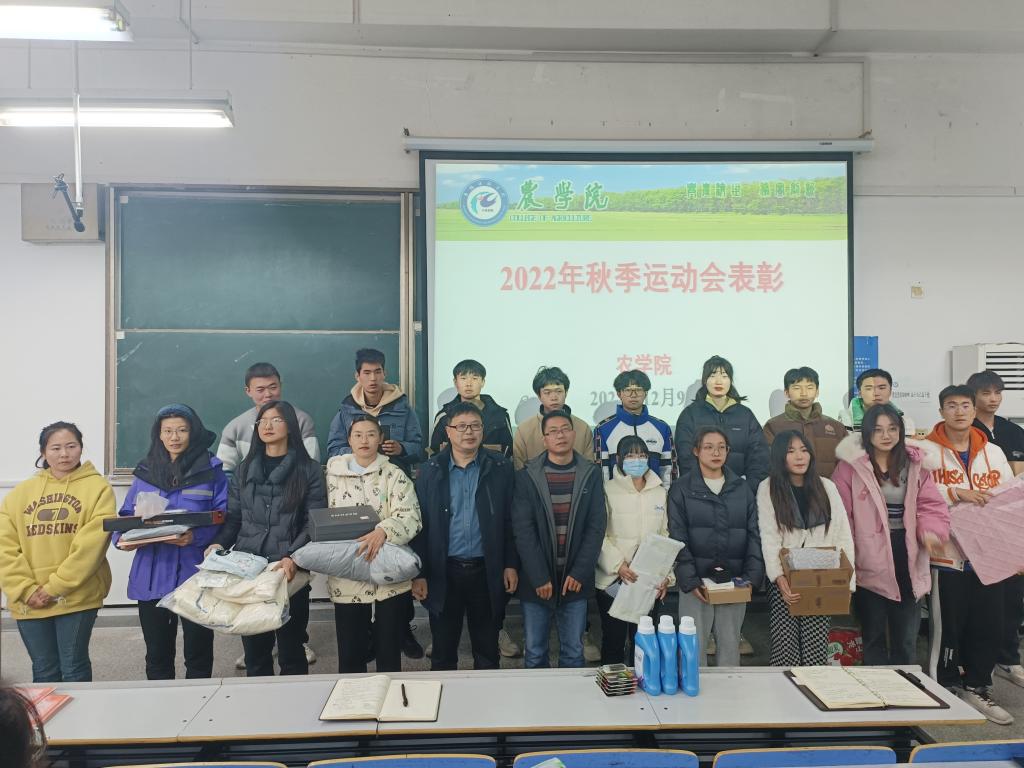 12月9日,农学院于求知楼A106召开2022-2023学年第一学期体育活动表彰会。农学院党委副书记、纪委书记张轶辉,副院长舒英杰,专职辅导员杨孝延、薛晶晶、吴荡出席此次表彰大会并为获奖学生代表颁奖,各项目获奖代表、获奖运动员代表、各年级班长、学习委员以及学生会全体成员参加大会。