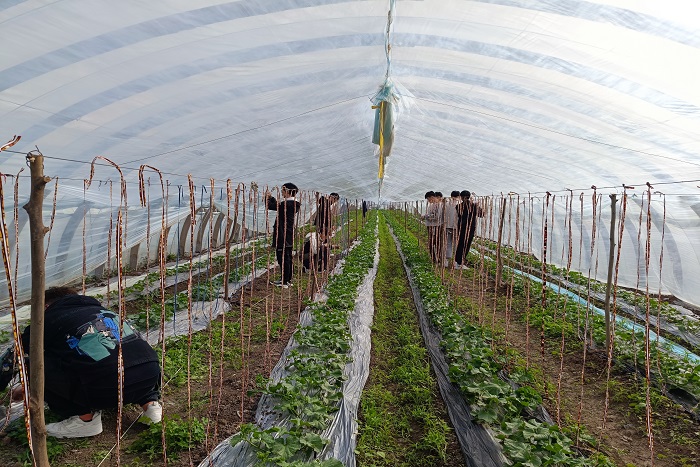 高青海讲解吊蔓要领、技巧和注意事项。同学们分组后,挽起袖子,头顶烈日下到蔬菜大棚,在农学院专业教师和农户的指导下有序开始吊蔓劳动。同学们走出教室、走进田园,在农业劳动过程中体验农耕,感受劳动的意义,盘线、剪线、绑绳、系苗等一系列活动有条不紊地进行着。经过三个小时的奋战,各组均完成了预定甜瓜吊蔓任务,作业效果得到了基地负责人的认可。