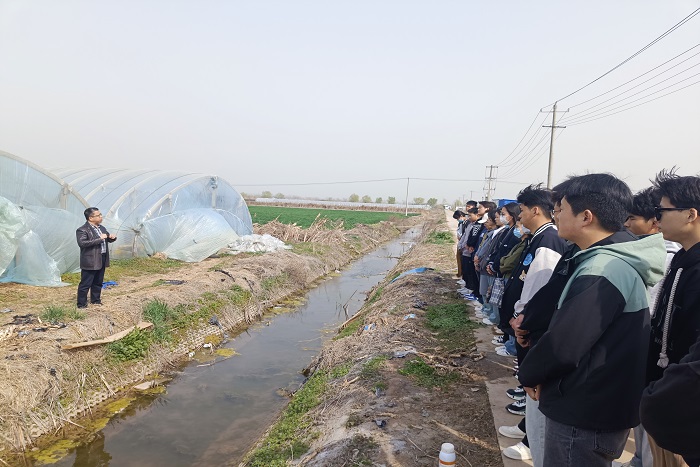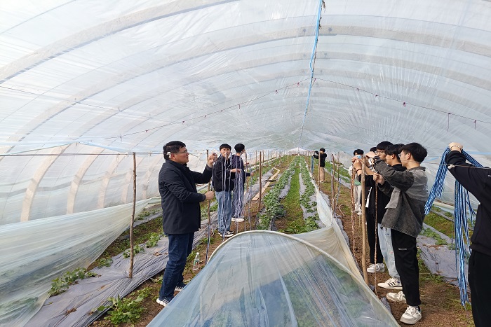耕读教育是我国五千年农业文明发展形成的特色文化。为让同学们了解农耕知识,体会耕读文化之精华,提高学生的动手实践和团队合作能力,3月15日下午,农学院党委书记何世潮,教务处副处长、创新创业学院副院长高青海带领园艺与设施农业科学与工程专业各年级50余名同学,前往安徽方邱湖农场方苑现代农业种植园开展耕读教育实践活动。