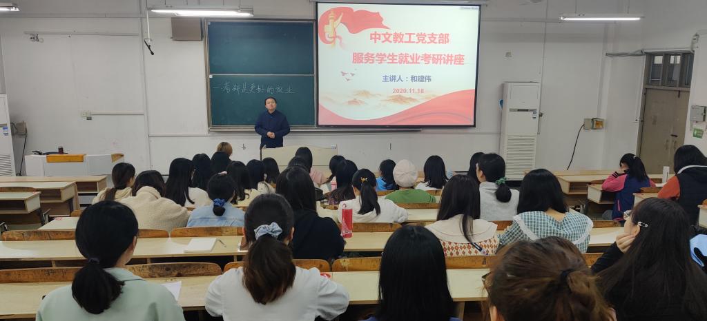 为帮助学生了解就业与考研形势,通过考研实现更好的就业,11月18日,中文教工党支部在求知楼A202教室开展“支部服务学生就业工程”活动,和建伟老师为汉语言文学2018级学生做了专题辅导讲座。