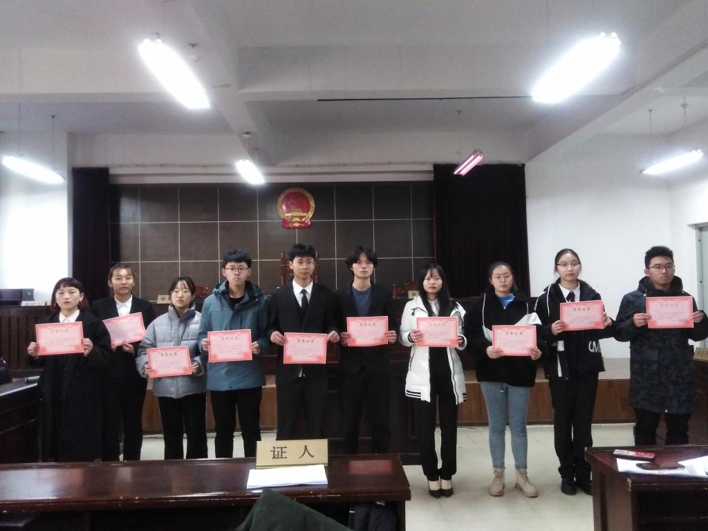 法学203陈状获“优秀审判长”荣誉称号,法学203韩永存、法学201闫祖瑶获得了“优秀陪审员”荣誉称号,法学203刘览,汉语言201高嵩获得了“优秀证人”荣誉称号,法学191杨梅、汉语言192童万雅获得了“优秀律师”荣誉称号,法学192俞红获得了“优秀书记员”荣誉称号,法学202黄紫薇,法学192马滢珺获得了“优秀演员”荣誉称号。