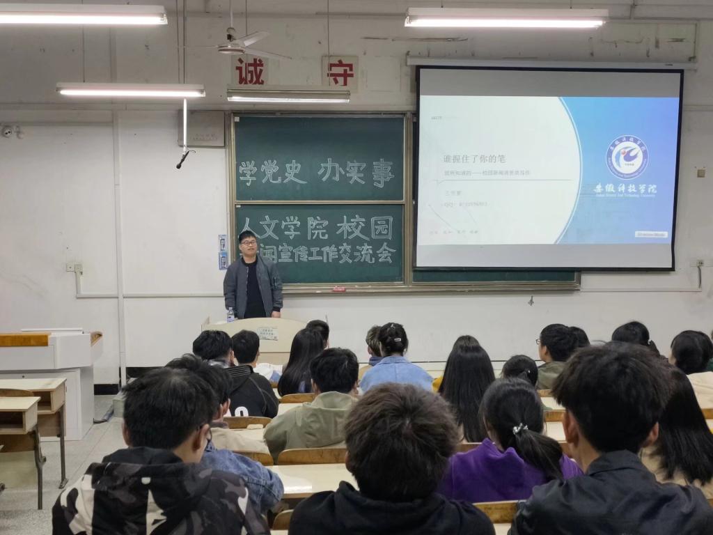 为进一步做好学院宣传工作,提高新闻宣传质量,4月14日晚,人文学院于求知楼A座105教室开展校园新闻宣传工作交流会,会议由校新媒体中心宣传骨干、编辑出版与汉语言文学学生党支部王明蕾主讲,学生会全体成员参加。