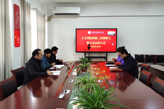 1月9日下午,人文学院在学院会议室召开四届二次教职工暨工会会员大会。会议采取线上+线下方式召开。学院党委书记杜士凤、副院长李晓东、副院长牛永辉、副书记李沙娜、分工会主席在会议室参加现场会议,其他老师通过腾讯会议参会。会议由李沙娜主持。