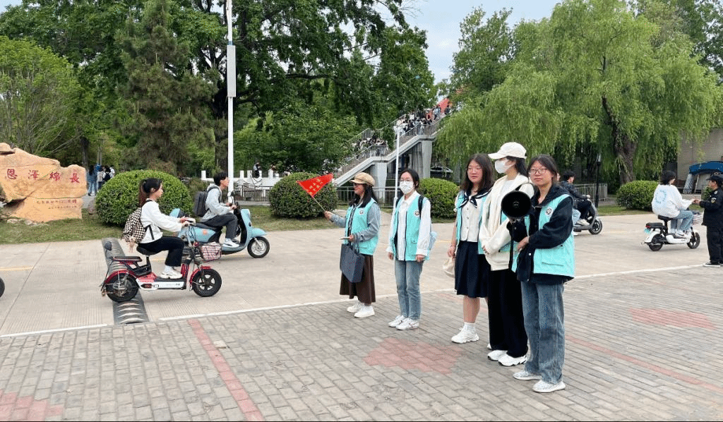 在交通秩序维护活动中,法学224班和汉语言文学224班认真负责的整理摆放好校门口的共享电动车,在课间和中午下课时分手持喇叭和引导旗帜维护校门口交通秩序,倡导同学们来往东西区走天桥,疏导大家有序出入校门,遵守交通规则,以保证门口车辆来往通畅、礼让行人。