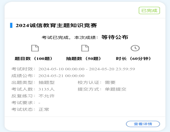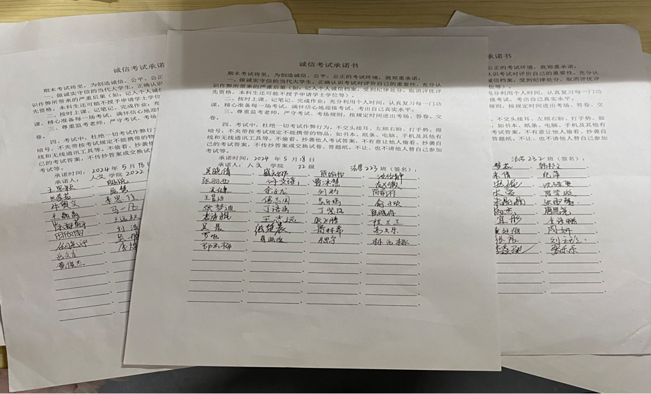 5月10日至18日,组织各班级同学签订“诚信考试承诺书”,教育引导同学们认真复习备考,严守考试、考场纪律,做诚实守信的大学生。