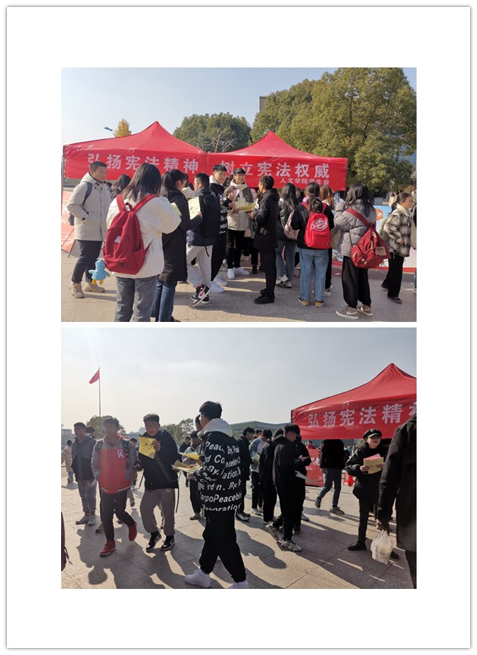 为深入学习宣传习近平法治思想,大力弘扬宪法精神,在广大师生中普及宪法知识、加强宪法教育、树立宪法权威,人文学院于12月4日在凤阳校区西区小广场组织开展了“宪法宣传周”宣传活动。活动由人文学院法学学生党支部、编辑出版和汉语言文学学生党支部以及学生会联合开展。