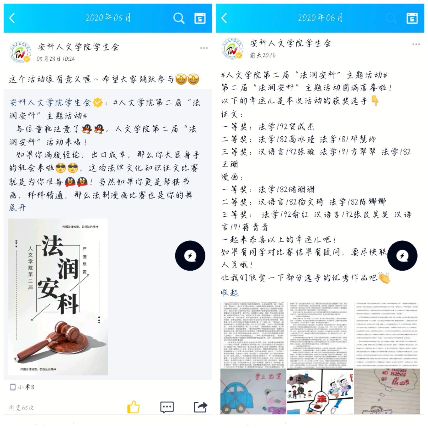 主题活动分为法律文化知识征文比赛和法制漫画比赛两部分,由参赛人员将其作品进行投稿,工作人员将作品上传至易班进行线上投票。活动期间,学生们皆踊跃参加,征文比赛中,选手们皆妙笔生花,以真实的笔触抒发出自己对法律最崇高的敬意,从他们的作品中,可以看出法律对国家、对社会、对个人的重要的作用;漫画比赛中,选手们以精湛的画技,充满寓意的构图,意味深长的配字对自己心中的法律进行了刻画,作品大多以宣传遵纪守法的社会公德为内容。学生们对此次活动十分关注,也积极进行了投票,评选出自己心仪的作品,最终,征文中,法学192贺成杰获得一等奖,法学182高冰瑾、法学181邓慧玲获得二等奖,汉语言文学192张璇、法学191方翠翠、法学182王珊获得三等奖。漫画比赛中,法学182储珊珊获得一等奖,汉语言文学182杨文琦、法学182陈娜娜获得二等奖,法学192俞红、汉语言文学192张良昊旻、汉语言文学191蒋青青获得三等奖。