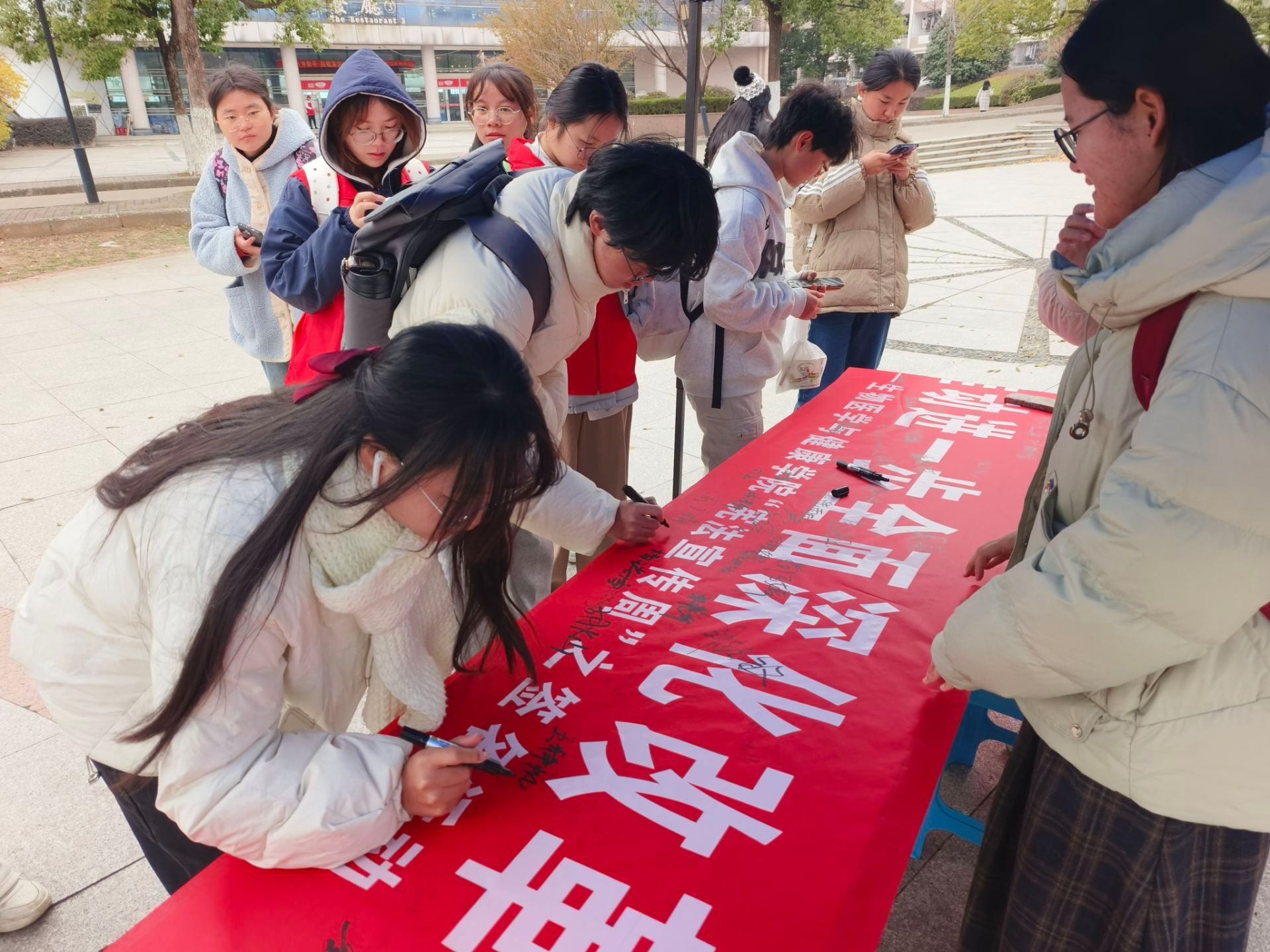在学知楼417会议室,学院部分领导、辅导员及学生代表一起学习了“宪法晨读”文本,观看了“宪法晨读”活动直播视频。在新知楼B103教室,学院正科级辅导员、正科级组织员、法治工作联系人邓艳萍为2024级部分学生骨干详解了“宪法是什么?宪法的地位如何?宪法规定了哪些内容?现行宪法是新中国成立以后第几部宪法?以及宪法与我们每个人生活息息相关”等内容。在“五四广场”举办了以“大力弘扬宪法精神,推动进一步全面深化改革 ”为主题的线下签名活动。在易班平台,开设了线上“法治与安全教育”主题课群和“学习宪法知识”系列推文。在2024级新生中,遴选13名同学组成合唱团,唱响了《宪法伴我们成长》歌曲。