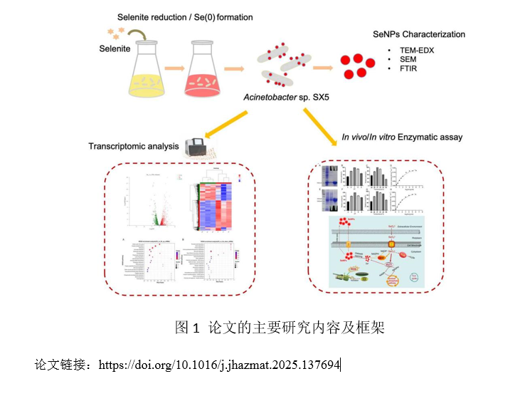 近日,生物医学与健康学院黄胜威副研究员团队及其合作者在纳米硒的微生物合成机制研究方面取得进展。相关研究成果以“Novel mechanisms for selenite biotransformation and selenium nanoparticles biogenesis inAcinetobactersp. SX5 isolated from seleniferous soil”为题,发表在环境领域国际知名期刊《Journal of Hazardous Materials》(中科院1区,影响因子12.2)。
