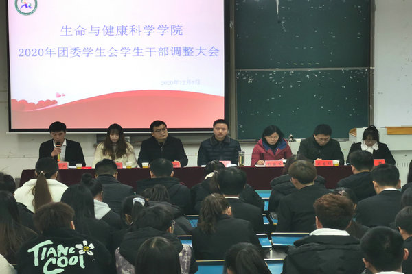 12月6日下午,生命与健康科学学院在新知楼B304教室召开2020年团委学生会学生干 部调整大会。学院党委书记詹学文、党委秘书彭丽萍、分团委书记王传林、分团委副书记刘国祥及专职辅导员黎冯梅出席会议。上一任学生会部分成员和现任团委学生会全体成员参加会议。会议由王传林主持。