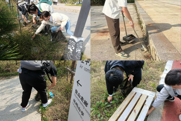 活动伊始,党支部书记和学生党员随手捡起沿途的垃圾,大家积极参与到实践活动,将塞得满满当当的垃圾袋带下山。同学们在清扫垃圾的过程中理解青年大学生需要的责任与担当,充分认识保护环境的重要性,体验劳动中的乐趣。在山顶,姜毅、刘国祥还向同学们介绍了多年前学院师生在后山植树的场景,回望山坡上郁郁葱葱的树林,同学们真切感受到了生态文明建设的重要意义。最后,各党支部在山脚下合影留念。