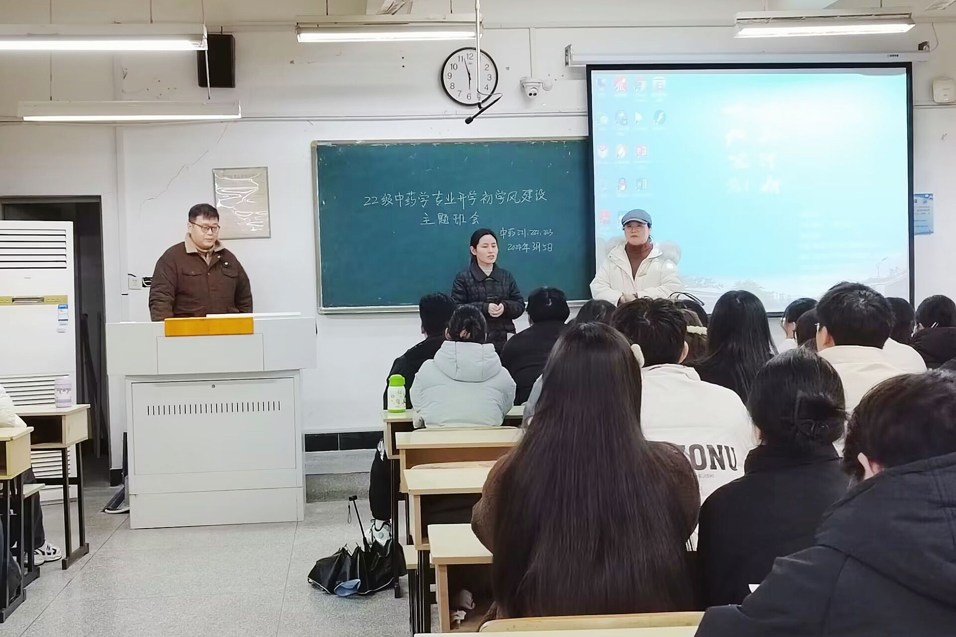 为提升辅导员与专业课教师协同育人实效,落实立德树人根本任务、增强思政教育实效性、促进大学生全面成长成才。3月8日下午,生命与健康科学学院2022级中药学专业班级辅导员邓艳萍携手班级导师孙浩和林敏两位老师,在求知楼A402教室与同学一起畅谈假期见闻,共话学风建设促成长。2022级中药学专业全体学生参加座谈会,会议由邓艳萍主持。