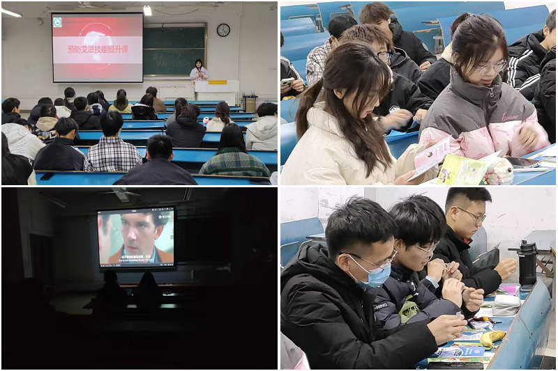 生命与健康科学学院青年志愿团白天在东区五四广场向同学们分发传单和宣传册,鼓励和邀请同学们在横幅上留下自己名字,积极加入共抗艾滋的活动中,并诚挚邀请同学们参加晚上预防艾滋病的同伴教育员培训讲座和观影活动。晚上在新知楼B304,青年志愿团为来自外国语学院、机械学院、动物科学学院等共计50余名同伴教育员进行预防艾滋病的技能培训讲座及观影活动。