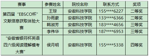 此外,在安徽省高等学校数字图书馆举办的“第四届‘EBSCO杯’文献信息获取体验大赛”中、 “安徽省银符杯英语四六级阅读理解模考大赛”中,我校学子也取得了良好的成绩。获奖名单如下: