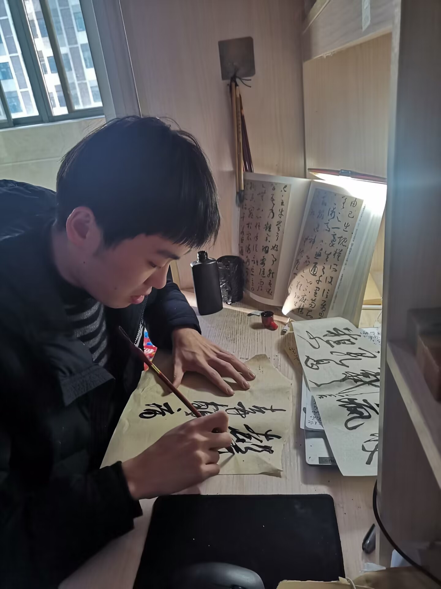 陶乐乐对学习充满热情,善于钻研,乐于将所学的知识融汇贯通并总结出一套自己的学习体系来丰富自己的学识境界。他具有丰富的想象力和创造力,在团队设计专利“数字化供水业务服务平台”的过程中,他提出了用“高斯曲线模型”和“数学方位视角”来解决其中一项有关客户体验感提升方法的问题。他曾以个人名义参加了“第二届安徽省大学生品牌创意设计大赛”A类赛事,并取得了省一等奖。他还十分痴迷于书法艺术,尤爱晋唐时期的潇洒书风。在任职“星空线上平台(集团)官方网站书美协会副会长”期间,他举办了书法知识竞赛、书法创作分享大会、书法艺术展等多项活动,除此之外,他还计划申请加入中国书法协会。