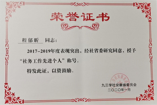 另讯,近日,从九三学社安徽省第十一届委员会第四次全体(扩大)会议上获悉,我校九三学社小组组长程郁昕教授荣获社省委2017-2019年度“社务工作先进个人”称号。(特约通讯员:魏居孟 摄影:魏居孟 审核:程郁昕 编辑:邓艳萍)