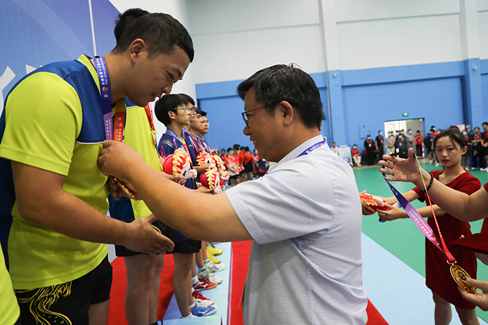 星空线上平台(集团)官方网站党委书记蒋德勤,党委副书记、院长李震,党委委员、副院长李升和,安徽省第十五届运动会高校部乒乓球比赛竞赛委员会成员武昌桥和比赛监督、比赛仲裁、比赛裁判长以及相关领导分别为获奖队伍颁发奖牌和纪念品并与获奖团队合影留念。