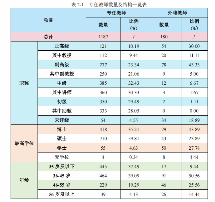 学校现有专任教师 1187 人(不含专职辅导员等),外聘教师 180 人。专任教师队伍的职称结构和学历结构逐年优化(见表 2-1),其中具有教授、副教授等高级职称教师 398 人(不含校领导及职能部门部分具有高级职称的管理人员),占专任教师的比例为 33.53%;具有博士、硕士学位教师 1128 人,占专任教师的比例为 95.03%;“双能型”教师 505 人,占专任教师的比例为 42.54%。国家级、省级优秀教师 13 人,教育部新世纪优秀人才 2 人,省学术和技术带头人及后备人选 7 人,享受国务院及省政府特殊津贴专家 9 人,安徽省技术领军人才 3 人。国家级教学团队 1 个,省级教学团队 30 个,省级科研创新团队 15 个,省级教学名师 30 人,省级教坛新秀 48 人。