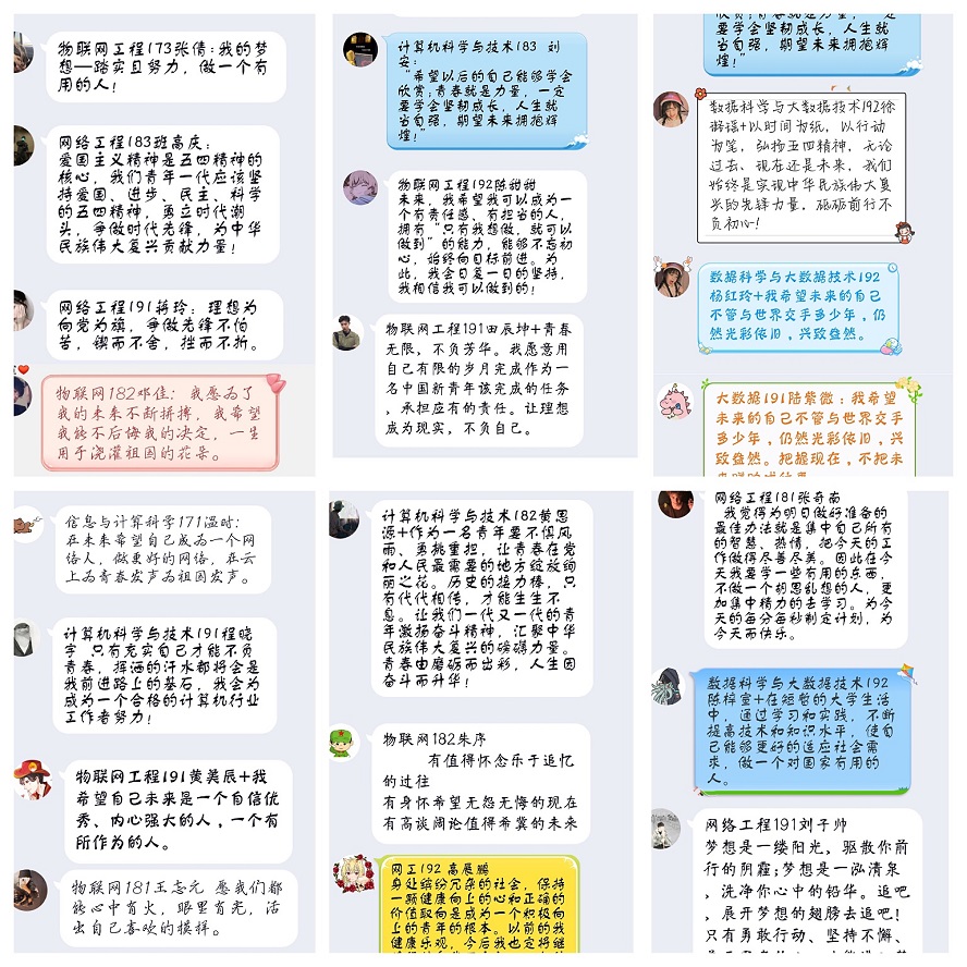 物联网工程191班田辰坤说:“青春无限,不负韶华。我愿意用自己有限的岁月完成作为一名中国新青年该完成的任务,承担应有的责任,让理想成为现实,不负自己,不辜负祖国培养”。数据科学与大数据技术192班徐璐瑶说:“以时间为纸,以行动为笔,弘扬五四精神,无论过去、现在还是未来,我们将永远砥砺前行,不负使命”。信息安全171班徐心宇说:“青年的我们是未来中国的脊梁,定不负期望,用自己行动展现自己的家国情怀和责任担当,成为有理想、有本领、有担当的新时代青年”。