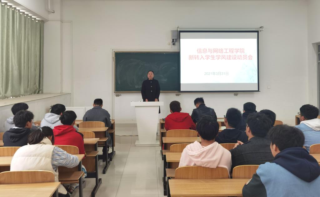 为进一步促进学院学风建设,全面了解新转入学生学习生活适应情况,3月31日下午,信息与网络工程学院在致知楼C105召开学院新转入学生学风建设动员会,学院党委副书记韦乃学、专职辅导员李军成、崔北坤及25名新转入同学参加了本次会议,会议由韦乃学主持。
