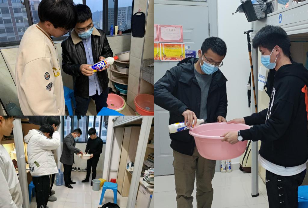 在疫情防控消杀物品发放工作结束之后,辅导员们紧密结合学校、学院对疫情防控工作的会议精神,深入学生宿舍,严格检查每一间学生宿舍卫生消杀情况。