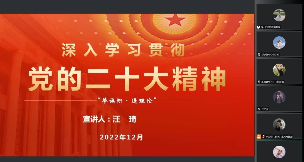 为深入学习宣传贯彻党的二十大精神,团结引领广大团员青年切实把思想和行动统一到党的二十大精神上来,12月26日晚,校辅导员理论宣讲团成员、信息与网络工程学院团委书记汪琦线上开展了党的二十大精神理论宣讲。该学院学生组织骨干、各年级学生骨干参加会议。