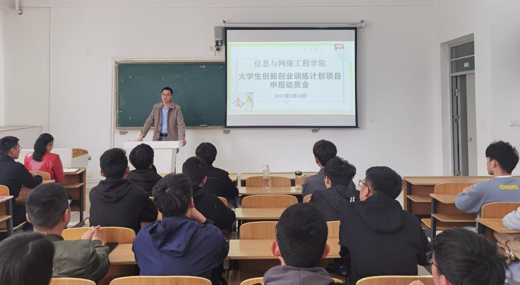 为推动学院创新创业教育工作的开展,促进大学生创新创业能力提高,3月30日,信息与网络工程学院在致知楼C103召开2021年大学生创新创业训练计划项目申报动员会,学院党委副书记韦乃学、副院长曹浩、专职辅导员李军成出席本次会议。19级,20级各班科创委员及学生会科创部全体成员参加了会议,会议由韦乃学主持。