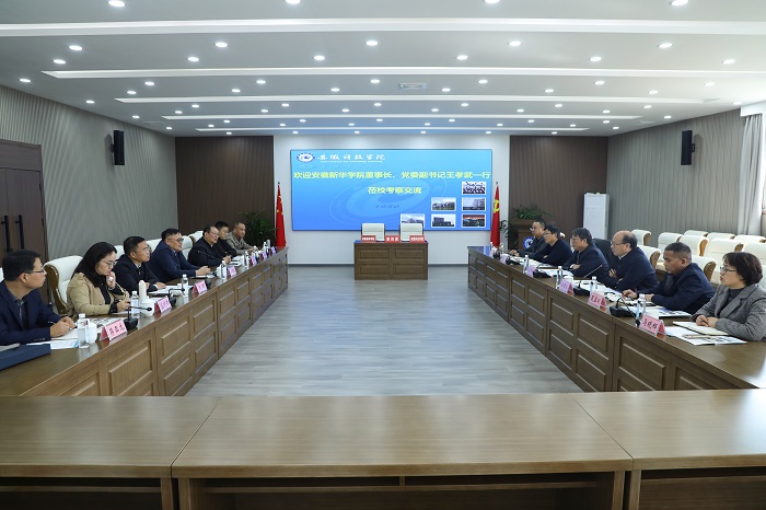 11月5日上午,安徽新华学院董事长、党委副书记王孝武、院长赵良庆、副院长戴昕、副院长王琦进一行7人莅校考察交流硕士学位授予单位创建及联合培养硕士研究生等工作。校党委副书记、院长李升和,党委委员、副院长王孝义及相关部门负责人热情接待王孝武一行。