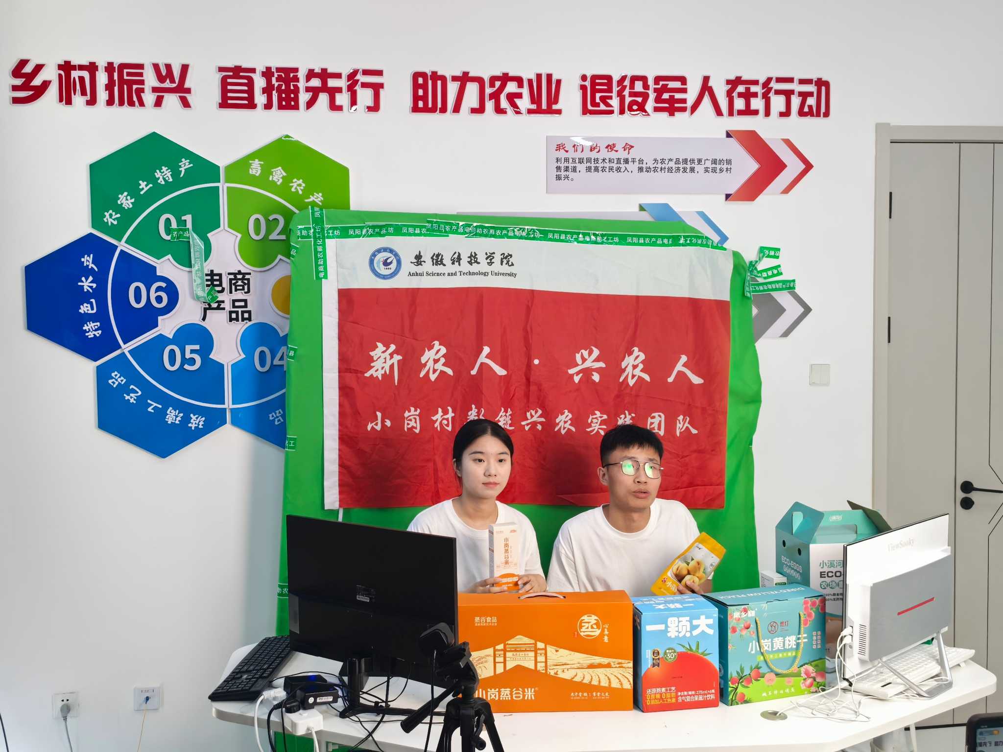 深入调研特色产业后,“数链兴农”团队将管理学科的营销智慧转化为助农实效。在电商直播基地,一场融合专业分析与乡土情怀的助农直播精彩呈现。直播筹备阶段,队员们提前了解小岗黄桃干、小岗蒸谷米、芝麻油等农副产品相关信息为直播做准备,团队成员分工协作,文案策划组深挖“生态散养”“古法工艺”等产品背后的故事;技术保障组调试设备、设计互动环节。在直播中团队成员更是使出“十八般武艺”,例如营养知识普及、改革历史溯源等,既详细讲解小岗蒸谷米“先蒸后碾”保留90%营养的独特工艺,又讲述养殖户凌晨三点收集鲜蛋的日常。经过队员们近两个小时的努力,最终累计取得10000+的点赞,1000+客流量的良好效果。“电商直播+文旅宣传”的发展模式,为小岗村吸引了游客和顾客,推动了文旅产业发展。通过助农直播,可以为小岗村的文旅产业振兴与人才振兴注入新的活力和动力,从而助力农村现代化改革,推动乡村振兴的新发展。