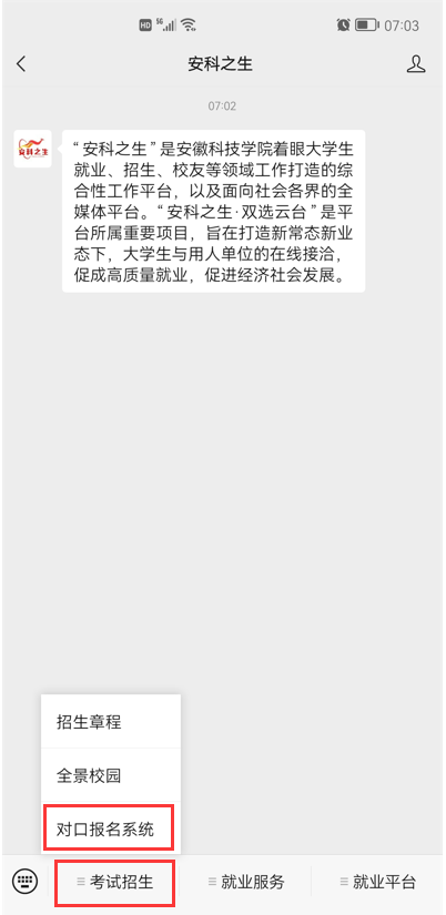 第一步:手机端请扫描下方二维码,关注星空线上平台(集团)官方网站招生办公室官方微信公众号“安科之生”,选择“考试招生”菜单,点击“对口报名系统”。电脑端可登录http://zsbexmprint.ahstu.edu.cn/dkbm,进行后续操作。